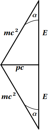 Second solution: Use conservation of 2-momentum, a vector quantity. That is, draw a momentum diagram, similar to a spacetime diagram but with units of either momentum (or, more commonly, energy), showing the 2-momenta both before and after the collision. Figure 10.1 shows such a diagram for the two lumps of clay. The initial configuration is represented by the two diagonal lines, one for each lump, moving in opposite directions; the final configuration is represented by the vertical line. Simple triangle trigonometry leads to the same computation as above, which can also be regarded as vector addition.