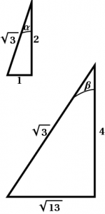 Suppose the speed (really the rapidity) of the VW is given by $\tanh\alpha$ and that of the Lincoln is $\tanh\beta$. A spacetime diagram showing the worldlines of the front and back of each car is shown in the first diagram in Figure 7.3. Since the cars appear to be the same length, these worldlines intersect along the horizontal axis. The “true” lengths of the cars, namely $L$ and $2L$, respectively, are also shown. Comparing the right triangles shown, whose right angles are indicated with dots, and which share a common (horizontal leg), we see that \begin{equation} \frac{L}{\cosh\alpha} = \frac{2L}{\cosh\beta} \end{equation} so that \begin{equation} \cosh\beta = 2\cosh\alpha \end{equation} But we are given that $\tanh\alpha=\frac12$, so that, using the small triangles shown in the second diagram in Figure 7.3, we have in turn that \begin{eqnarray} \cosh\alpha &=& \frac{2}{\sqrt{3}} \\ \cosh\beta &=& \frac{4}{\sqrt{3}} \\ \tanh\beta &=& \frac{\sqrt{13}}{4} \end{eqnarray} so that the Lincoln is moving at $\frac{\sqrt{13}}{4}$ the speed of light.