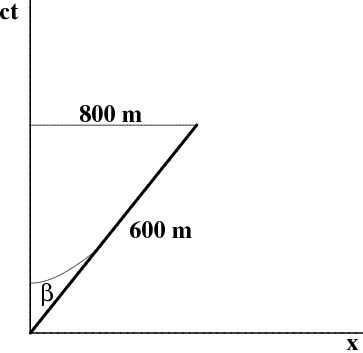The lifetime of the muon must be measured in its own rest frame. Geometrically, we have the triangle in Figure 7.1, whose hypotenuse is $2c\times10^{-6}=600$ meters. The remaining leg of this 3–4–5 triangle is easily seen to be 1000 m, from which we can read off \begin{equation} \frac{v}{c} = \tanh\beta = \frac45 \end{equation}