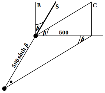 This situation is shown in Figure 7.4, from the shared reference frame of the clairvoyante (C) and her brother (B). The worldline of the scientist (S) is tilted to the right with (hyperbolic) angle $\beta$; his lines of simultaneity make the same angle with the horizontal axis. His time is measured along his own worldline, so we are looking for the “distance” between the two heavy dots. Triangle trigonometry does the rest; this leg has length \begin{equation} 500\sinh\beta = 1200 \hbox{km} \end{equation} where we have made use of the smaller 5–12–13 triangle shown in the figure to compute $\sinh\beta=\frac{12}{5}$ from $\tanh\beta=\frac{12}{13}$. Converting this to a time by dividing by $c$, we conclude that the scientist observes the brother hit his thumb $4\times10^{-3}$ seconds before Sophie cries out.