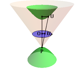 The idea of stereographic projection is the same for our Minkowskian hyperboloid. But what are the Poles? As before, they are the two points where the $t$-axis intersects the hyperboloid, but now we need both branches. So the South Pole is the point \begin{equation} P = (0,0,-\rho) \end{equation} (just as for the sphere) and stereographic projection maps each point on the ($t>0$ branch of the) hyperboloid to the interior of a disk in the $xy$-plane.