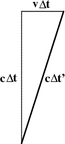 The edges of these two triangles have the same lengths! To see this, note first of all that they share one edge. But each of the remaining pairs of edges form the legs of a right triangle, whose hypotenuse is the beam of light. Since the speed of light is 1 (in appropriate units), in each case the legs must have the same length. This argument justifies the labeling used in Figure 6.5, and can in fact be used to derive the hyperbolic Pythagorean theorem, which says here that \begin{equation} (c\,\Delta t')^2 = (c\,\Delta t)^2 - (v\,\Delta t)^2 \end{equation} or equivalently that \begin{equation} t' = \frac{t}{\cosh\beta} \end{equation} where $\tanh\beta=v/c$ is the speed of the train. Moving clocks therefore run slow, and by a factor of precisely $\cosh\beta$.