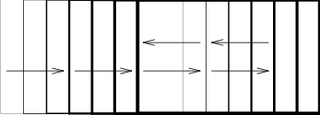 What does the observer on the ground see? Don't forget that the train is moving, so that, as shown in the second sketch, the distance traveled in one direction is different from that in the other. More precisely, light starting from the back of the train must “chase” the front; if it takes time $\Delta t_1$ to catch up, then the distance traveled is $\Delta x + v\,\Delta t_1$, the sum of the length of the train (as seen from the ground!)\ and the distance the front of the train traveled while the light was under way. Similarly, if the time taken on the return journey is $\Delta t_2$, then the distance traveled is $\Delta x - v\,\Delta t_2$. Thus, \begin{eqnarray} \cc \,\Delta t_1 &=& \Delta x + v \,\Delta t_1 \\ \cc \,\Delta t_2 &=& \Delta x - v \,\Delta t_2 \end{eqnarray} or equivalently \begin{eqnarray} \Delta t_1 &=& \frac{\Delta x}{\cc - v} \\ \Delta t_2 &=& \frac{\Delta x}{\cc + v} \end{eqnarray} Combining these results leads to \begin{eqnarray} \cc \,\Delta t &=& \cc \,\Delta t_1 + \cc \,\Delta t_2 \nonumber\\ &=& \frac{2\,\Delta x}{1-\vvcsq} \end{eqnarray} and comparing with ($\ref{time}$) and ($\ref{length}$) leads to \begin{equation} \Delta x = \gammainv \> \Delta x' = \frac{1}{\gamma} \,\Delta x' \end{equation} Thus, a moving object appears to be shorter in the direction of motion than it would be at rest; this effect is known as length contraction.