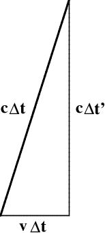 To compute how the times are related, we must first introduce some notation. Let $t$ denote time as measured on the ground, and $t'$ denote time as measured on the train; we will similarly use $x$ and $x'$ to measure length. One tick of the clock as seen on the train takes time $\Delta t'$, where \begin{equation} h = \cc \,\Delta t' \label{height} \end{equation} Suppose the same tick takes time $\Delta t$ as seen from the ground. In this time, the light travels a distance $\cc \,\Delta t$, which is the hypotenuse of a right triangle with legs $h$ and $v\,\Delta t$. As shown in Figure 2.5, the Pythagorean Theorem now leads to \begin{equation} (\cc \,\Delta t)^2 = (v \,\Delta t)^2 + h^2 \end{equation} which can be solved for $h$. Comparing the result with ($\ref{height}$), we obtain \begin{equation} \Delta t = \frac{1}{\sqrt{1-\vvcsq}} \>\Delta t' \label{time} \end{equation} which indeed shows that the moving clock runs slower than the stationary one ($\Delta t > \Delta t'$), at least for speeds $v<\cc$. The factor relating these times shows up so often that we give it a special name, defining \begin{equation} \gamma = \frac{1}{\gammainv} \end{equation}